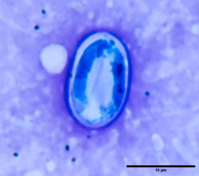 Oocysts are oval, approximately 10–15 µm in size, with a well-defined wall. Inside, four sporocysts can be identified. Their content consists of elongated sporozoites, clearly visible in native preparations.