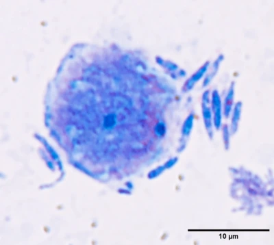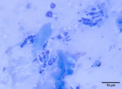 Споры хорошо выявляются в слизистом содержимом внутренних органов.